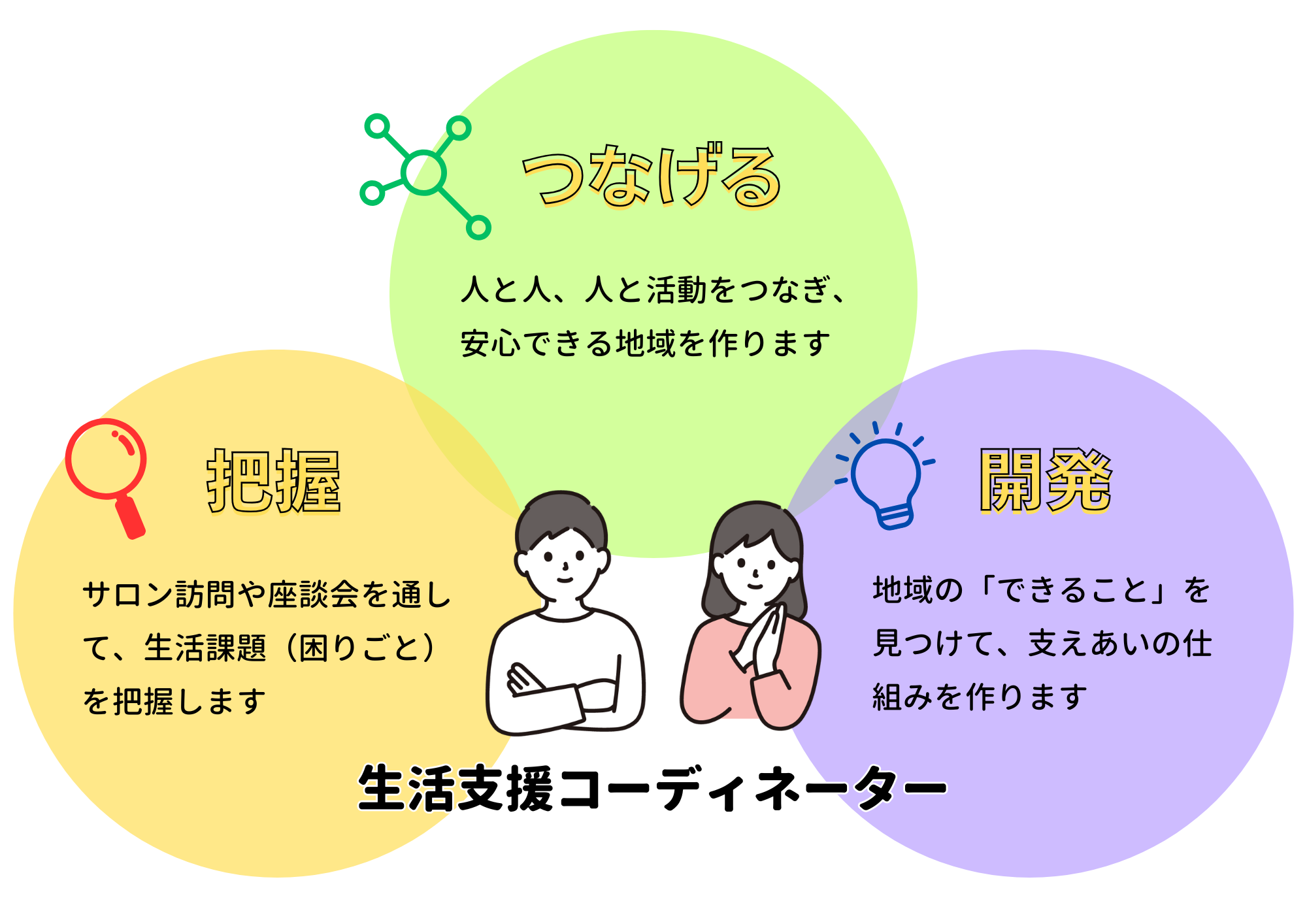 苫小牧市の地域ごとの特色や、生活課題(困りごと)を把握し、地域のネットワークづくりや、困っている人と担い手、担い手と地域をつないで、支えあいのお手伝いをします。また、地域の困りごとに応じたサービスの開発や、担い手発掘・育成など行います。