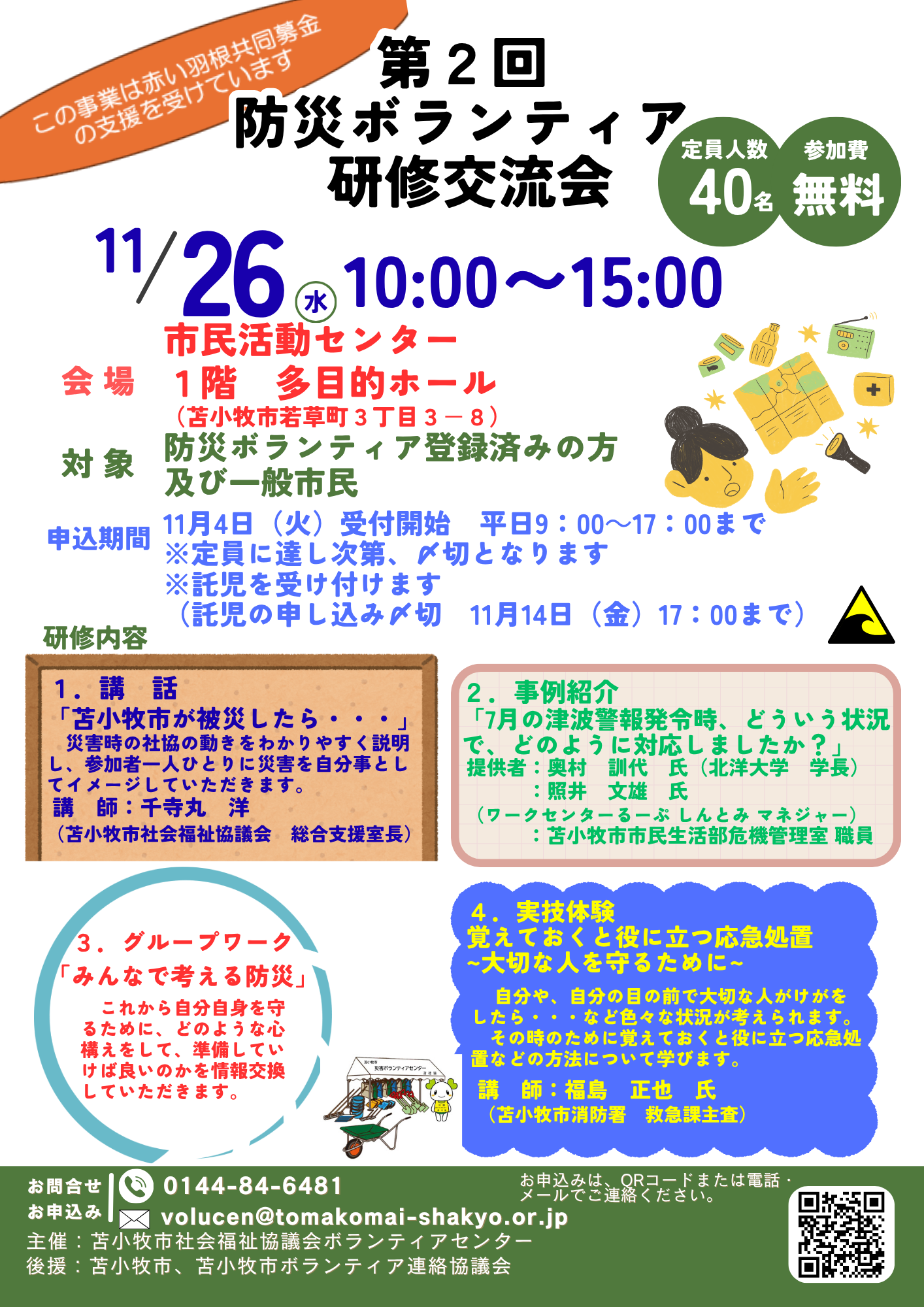 | 3 | 防災ボランティア研修交流会 | 防災ボランティアに登録済みの方及び一般市民 | 40名 | ・1回目 →終了しました。 ・2回目 →11月26日(水) |